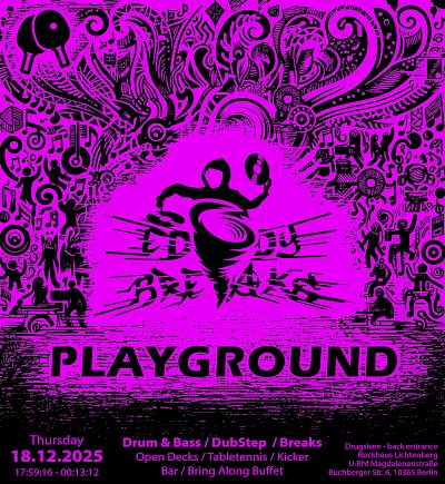 Thursday 18.12.2025 17:59 Drugstore im Rockhaus (Buchberger Straße 6, 10365 Berlin - Lichtenberg) Drum&Bass IDM/Glitch/Breakcore HipHop/Rap/Trap Downtempo/Dub Garage/Grime/Dubstep Breakbeat/BigBeat Jungle
